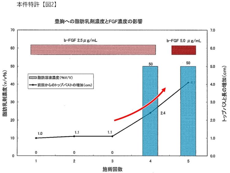 従来の豊胸術には、シリコンジェルバッグ等のインプラントの挿入や、ヒアルロン酸の注入といった手法がありましたが、安全性や効果の持続性に課題がありました。本件発明は、従来のインプラント挿入やヒアルロン酸注入に伴う問題点を回避し、乳腺周囲に脂肪組織を生成・増加させて皮下脂肪組織の蓄積・増大を図ることを目的としています。具体的には、被施術者自身の血漿中に含まれるタンパク質や脂質等がb-FGFの作用と相まって皮下組織の増大に寄与し、さらに脂肪乳剤を補充することで効果的に脂肪組織の蓄積・増大が図れるとされており、以下の3つの成分を組み合わせる(含有する)点に技術的特徴があります。