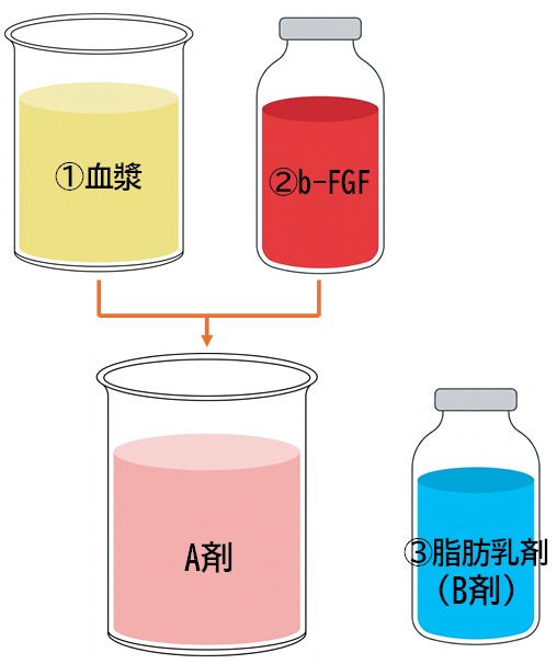 このように、被施術者由来の血漿に市販の2つの医薬品を混合するという組み合わせにより、単独使用よりも効果的に脂肪組織の蓄積・増大を図ることができるとされています。