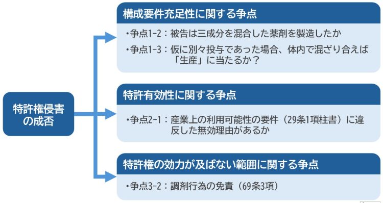 控訴審では、事実認定(混合していたか否か)に加え、医療関連発明の特許性や医師の行為に対する特許権の効力という、特許制度の根本に関わる法的論点が深く掘り下げられました。本件で設定された計11の争点のうち、特に重要なものは以下のとおりです。