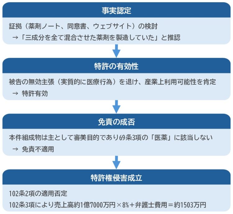 また、69条3項の立法趣旨について、同条項は医師が病気の治療等のために最も適切な医薬を選択し処方せんを介して調剤する行為を「医療行為の円滑な実施という公益の実現」の観点から、当該医師の選択が特許権により妨げられないようにするものであるところ、少なくとも本件発明に係る豊胸手術に用いる薬剤の選択については、このような公益を直ちに認めることはできないとしました。